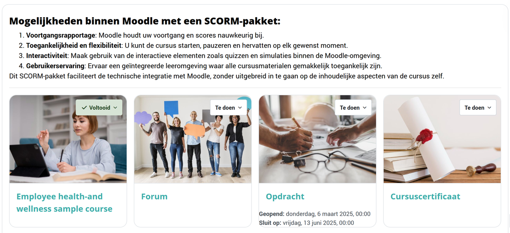 Cursus SCORM mogelijkheden, activiteiten weergegeven met eigen afbeeldingen en voltooiing per activiteitstegel: