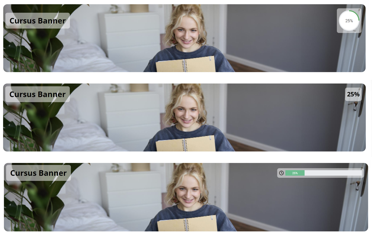 Cursus-banners met visuele voortgangsindicatoren (cirkel, cijfer, balk).