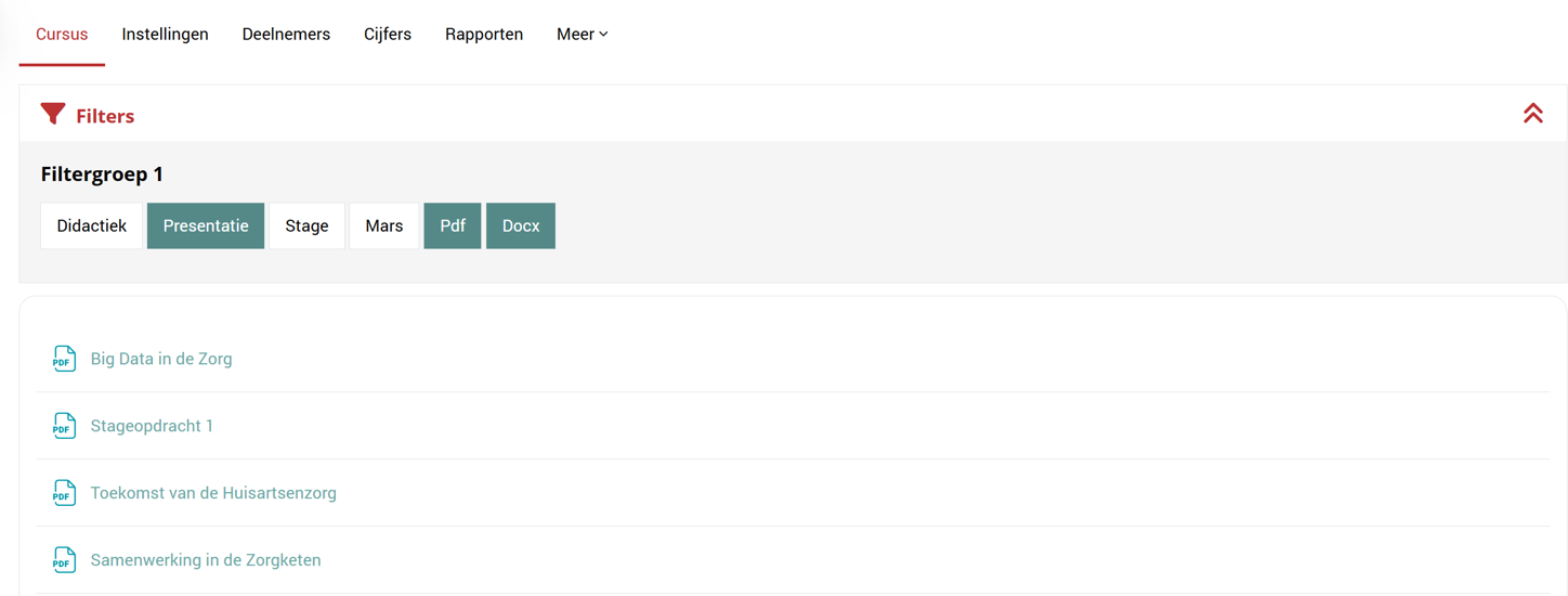 In de bibliotheekmodus behoud je ook bij grote cursussen met duizenden items overzicht en snelheid, dankzij slimme filters en dynamisch laden van inhoud.