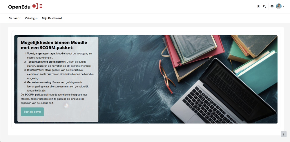 SCORM-modules worden gepresenteerd in een schone, gefocuste weergave, waarbij alle overbodige Moodle-navigatie is verborgen. Dit zorgt voor een professionele, applicatie-achtige ervaring.