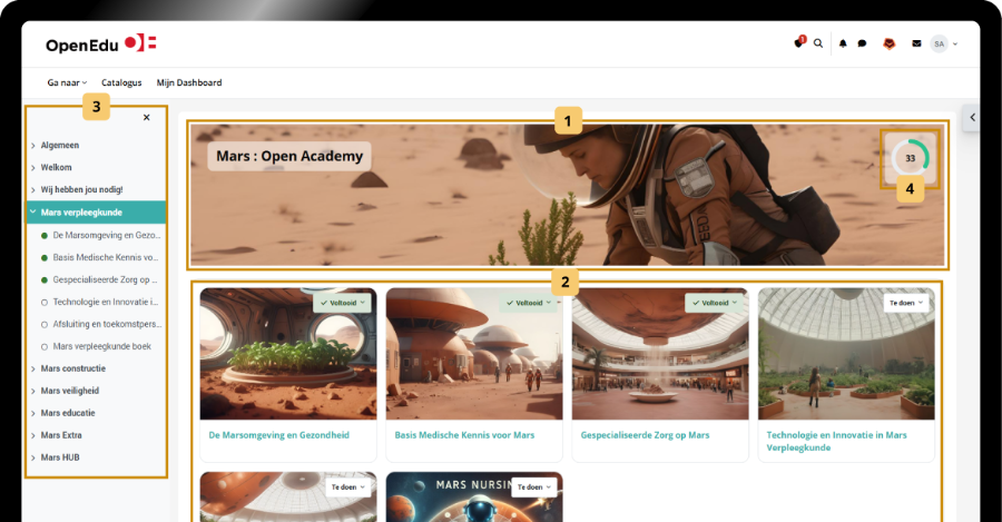 Het Authora cursusformaat van OpenEdu is ontworpen om uitgebreide cursussen overzichtelijk en visueel aantrekkelijk te presenteren. Beheerders kunnen subsecties op elk niveau toevoegen, wat zorgt voor een flexibele structuur. Met dynamisch laden van inhoud is de laadsnelheid geoptimaliseerd, terwijl banners, tegels en iconen de activiteiten een professionele uitstraling geven. Dit formaat maakt cursussen niet alleen gebruiksvriendelijk, maar ook visueel onderscheidend.